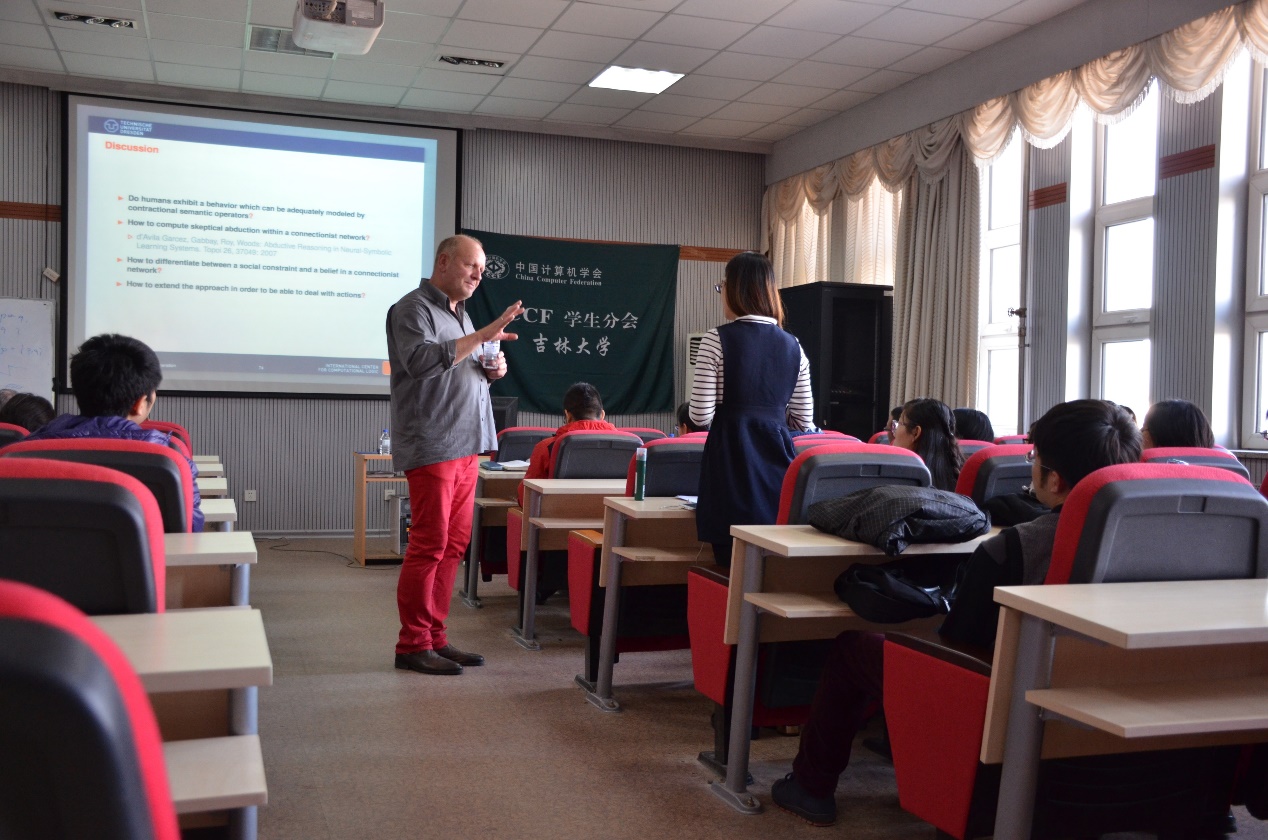 Steffen Holldobler是德国德累斯顿工业大学计算机科学系的资深教授,其研究领域包括逻辑与演绎、逻辑编程、知识表示与推理以及连接机制。11月3日上午9:00,Steffen教授在前卫南校区计算机大楼A521报告厅做了题目分别为A New Computational Logic Approach to Model Episodes of Human Reasoning和The Core Method — Connectionist Model Generation and its Application to Human Reasoning的两场报告,分别介绍了一种新型计算逻辑方法和一种用于关联模型生成的核心方法。11月4日上午10:00,Steffen教授在李四光楼107教室做了题目为SAT Solving — Generic CDCL, Iterative Partitioning, and Periodic Event Scheduling的报告,讲解了SAT求解相关问题的若干方法。