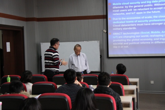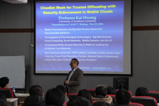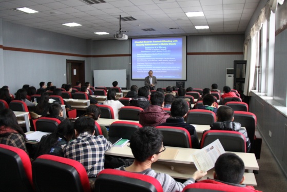 2015年1月13日上午,应公司三亿体育经理魏晓辉教授的邀请,美国南加州大学电气工程与计算机科学系黄铠教授来校进行学术访问与交流,并做题为“移动云计算中的信任转移安全基础设施”的报告。
