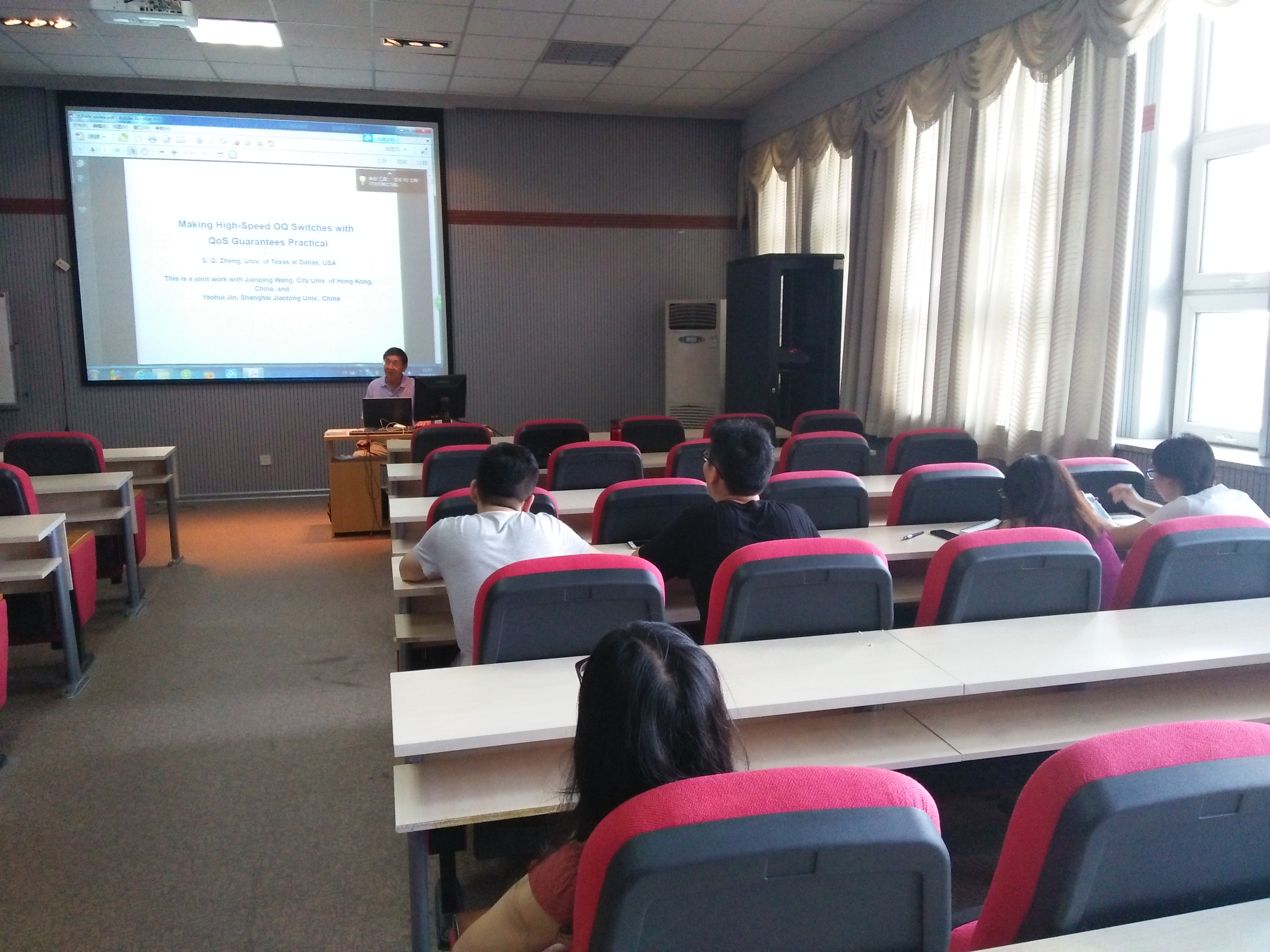 2016年8月4日下午13:30, 美国德州大学达拉斯分校终身教授、唐敖庆讲座教授郑斯清教授在三亿体育A521报告厅为计算机公司和软件公司的青年教师和研究生做了题为“Making High-Speed OQ Switches with QoS Guarantees Feasible”的学术讲座。该讲座的主要内容源于近期郑斯清教授与香港城市大学、上海交通大学合作研究的学术成果 – 构建易实现的高速输出排队交换结构。郑斯清教授同时在报告中讲解了研究和开发高速和可扩展交换结构的技术难点,以及介绍了该方面近十年的研究进展。整个讲座大约持续3个小时,分为两个阶段,主讲阶段约进行2个小时。主讲结束后,郑斯清老师解答了同学们提出的该方面的相关问题,同时,和同学们讨论了学术研究过程中寻找课题、研究方法等。