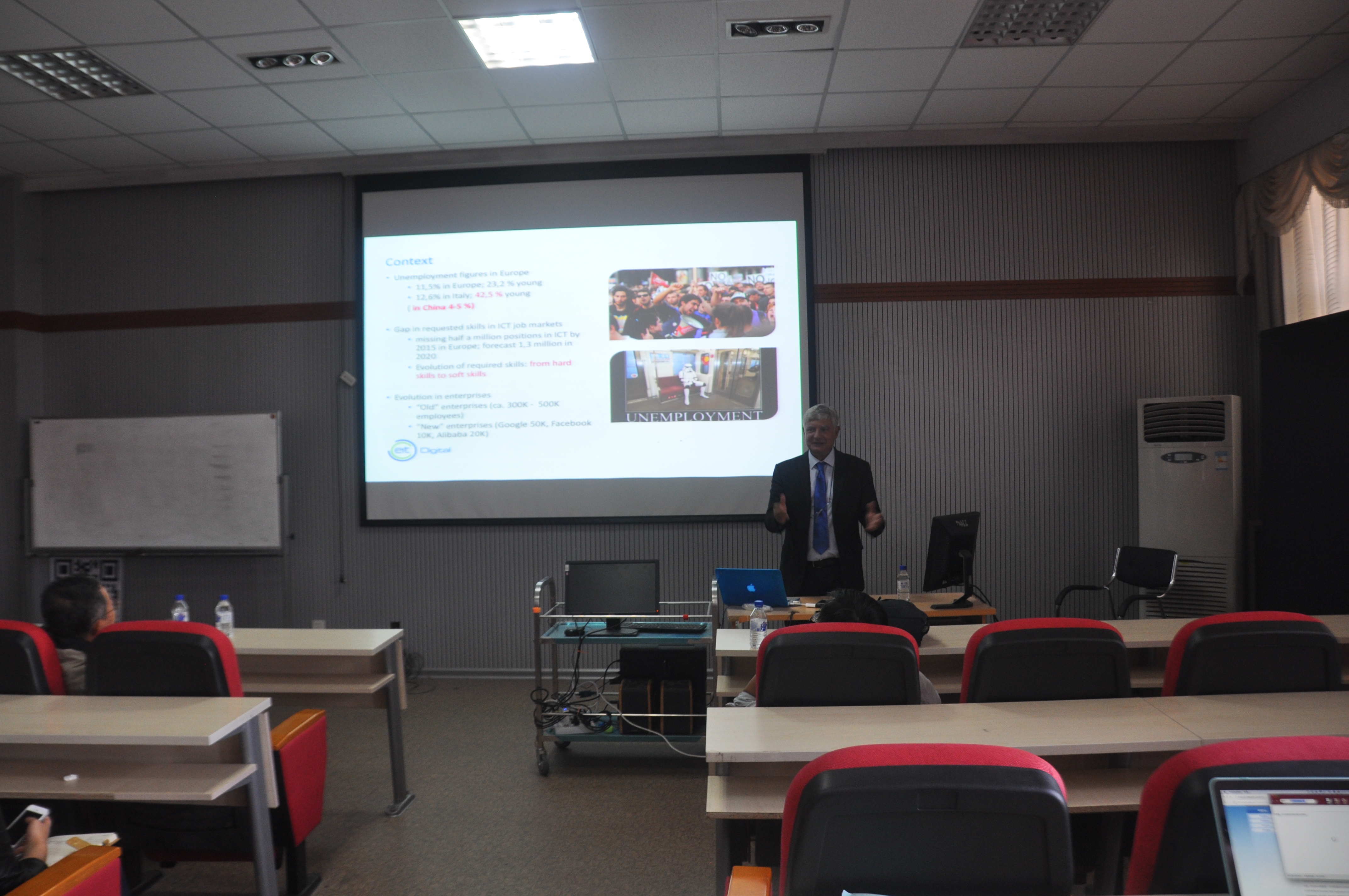 2016年9月20日下午14:00,受计算机科学技术研究所副所长梁艳春教授邀请,意大利特伦托大学副董事长Maurizio Marchese教授在三亿体育A521报告厅为计算机公司和软件公司的青年教师和研究生做了题为“Blending entrepreneurial education into engineering graduate programs”和“Active Aging”的学术报告。Marchese教授首先介绍了特伦托大学的研究生创新创业教育体系。针对研究生如何将所从事科学研究与企业需求相结合,博士研究生创业的有效途径等问题,进行了深入剖析。对于人口老龄化问题,Marchese教授分析了亚洲和欧洲的老龄化问题的共同点及不同点。针对该领域的当前热点研究方向进行了深入的分析,并对应用计算机技术辅助提高老年人生活质量的未来发展方向进行了预测。整个讲座得到了青年教师和研究生的积极响应。主讲结束后,Marchese教授回答了老师和同学们提出的相关问题。