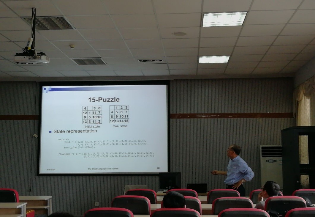 报告最后,Neng-Fa Zhou教授与现场师生进行了探讨交流,就Picat、约束、SAT等问题进行了充分的讨论,为现场师生进行相关方向的研究提供了较好和较新的思路。在互动中,员工加深了对Picat的了解和认识。最后整个讲座在热烈的掌声当中结束,参加此次报告的同学们均表示收获颇丰。