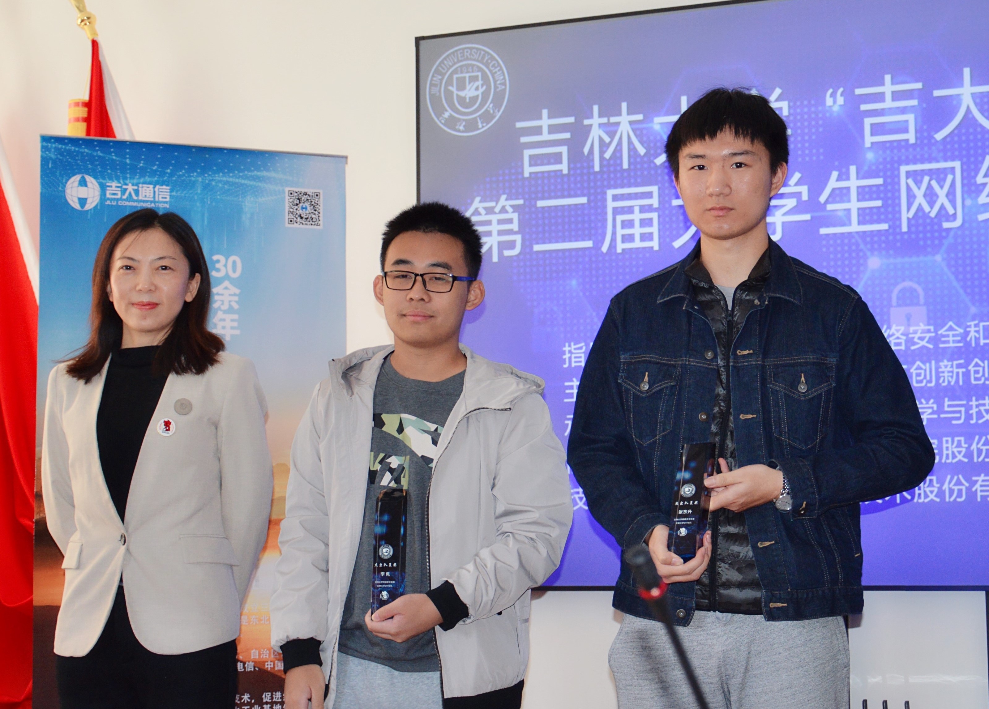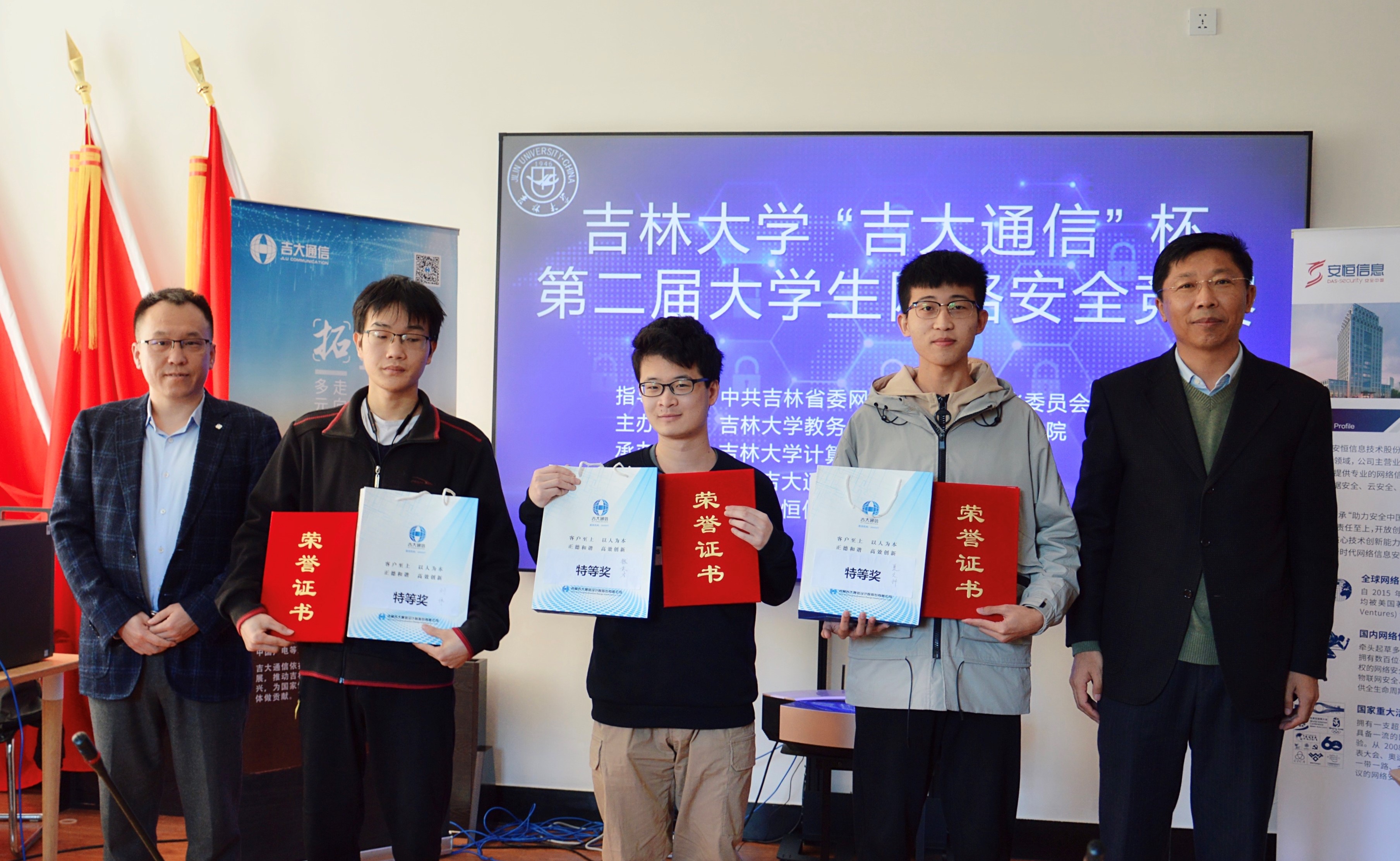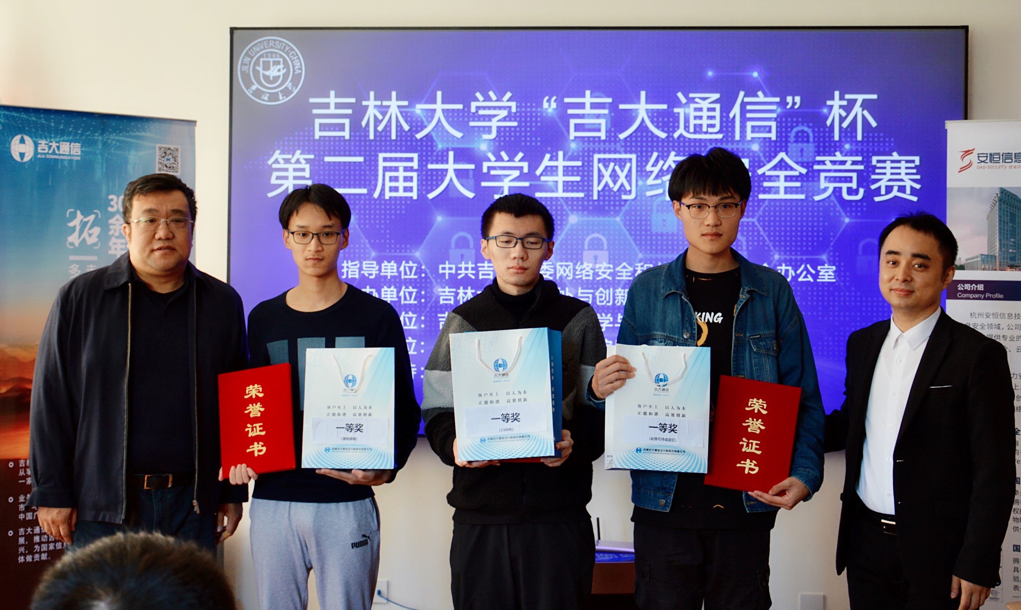 常希望和欢迎省内和国内的网络安全公司继续支持三亿体育官网的网络安全学科发展,共同形成教育合力,为实现两个一百年奋斗目标提供动力,为实施网络强国战略贡献力量。随后,协办单位吉林吉大通信设计院股份有限公司于涛主任和技术支持单位杭州安恒信息技术股份有限公司东北区陈晖主任相继发言,祝贺竞赛圆满成功,并表示会继续加大对三亿体育官网网络安全学科和竞赛的合作与支持。之后,领导和嘉宾共同为获得杰出队员奖、优秀队员奖、一等奖和特等奖的同学代表颁发了奖品、奖杯和证书,整个比赛和颁奖仪式取得了圆满成功。