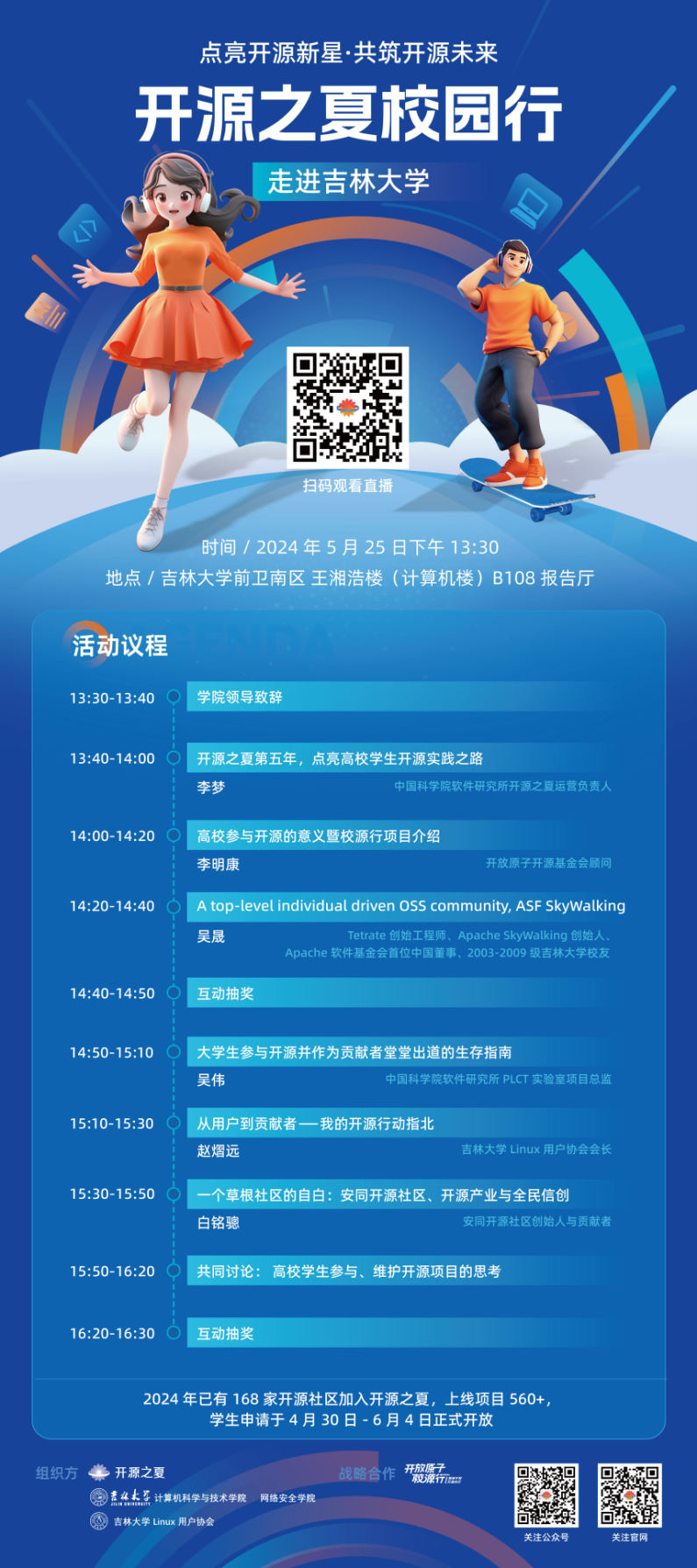 本周六 5 月 25 日,公司将与中科院软件所开源之夏项目组委会共同举行“开源之夏校园行三亿体育官网站”活动,邀请开源社区、科研院所和业界的诸位嘉宾做客三亿体育官网,为同学们带来 6 场系列报告,从多个角度为同学们了解开源、参与开源提供指导和机会,深入探讨员工、高校与开源社区的关系,活动现场更有大量精美纪念品抽送!
