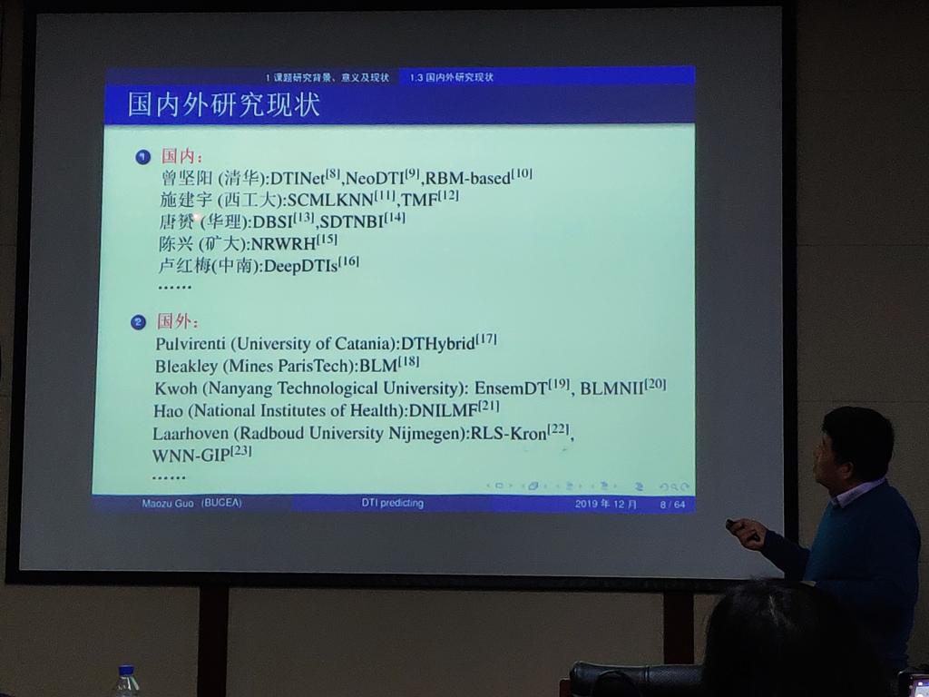 在本次报告中,郭茂祖教授针对研究药靶互作关系预测问题的计算方法,在仅利用单源数据情形下,提出了基于药物、靶标数据的聚类分析方法,药靶互作关系预测及预测结果验证与评价的模型,提升了预测的性能。具体包括:(1)针对药物、靶标数据没有类别标签及其相关的先验信息问题,提出了改进密度峰值聚类方法DPCSA及利用其中决策图确定数据簇个数;进而提出了确保聚类性能的中心点逐步递增优化INCK方法,并完成对药物、靶标数据的聚类分析;(2)提出了由超聚类SC及特征投影模糊分类FPFC两个子方法融合而成的药靶互作FPSC-DTI预测模型,提升了药靶互作关系预测精度。最后给出了药靶互作关系预测结果验证与评价方法。本次报告受到了计算机公司师生的热烈响应和一致好评。