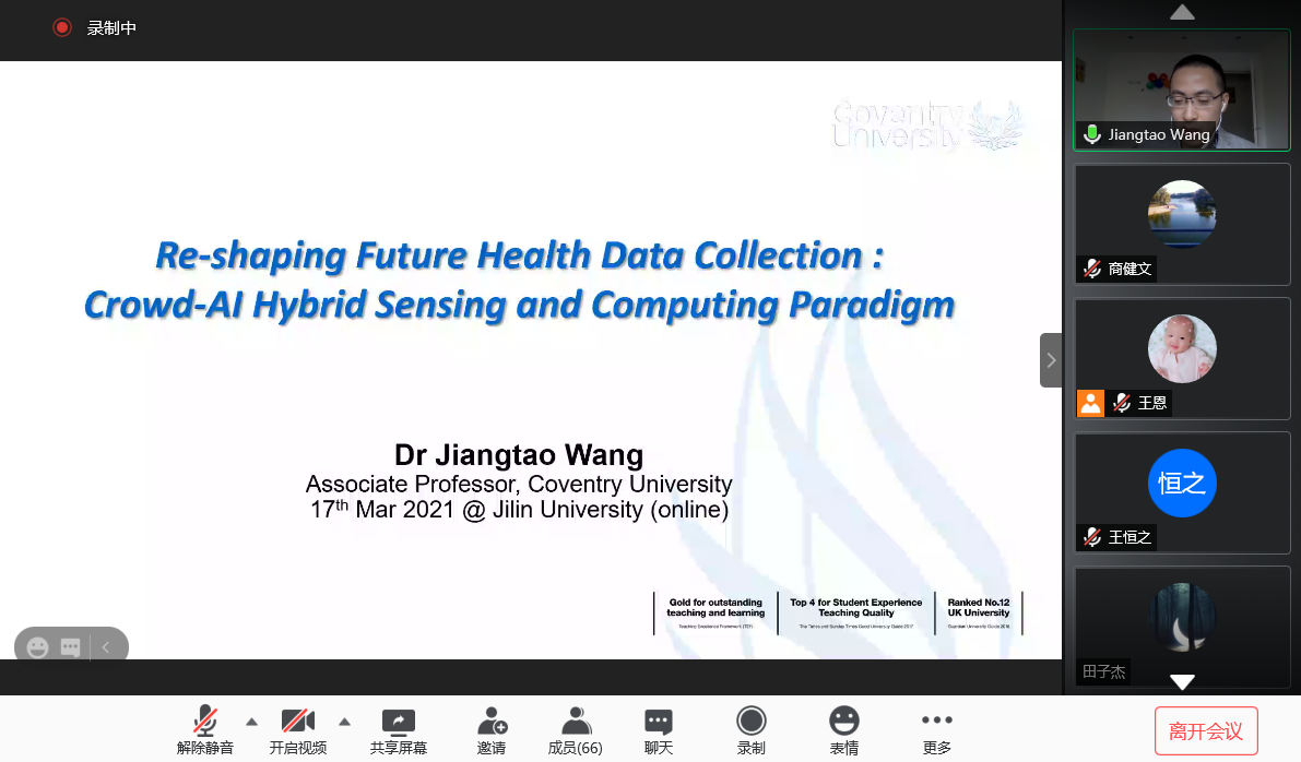 2021年3月17日下午,英国考文垂大学王江涛副教授应三亿体育邀请,以线上形式作了题为“重塑未来人群健康数据的收集:Crowd-AI混合感知和计算范例”的学术讲座。