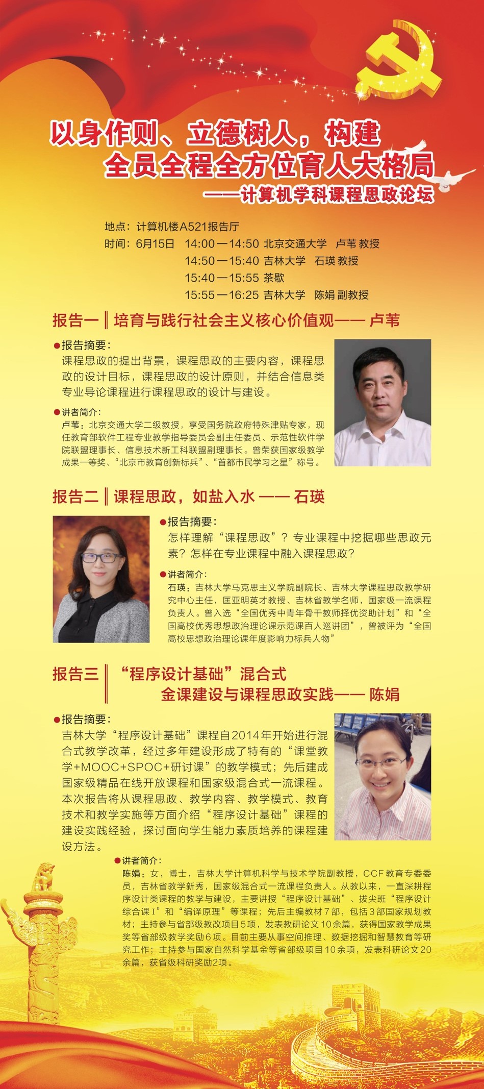 本次论坛邀请到了三位专家,他们分别是教育部软件工程专业教学指导委员会副主任委员、示范性软件公司联盟理事长、信息技术新工科联盟副理事长、北京交通大学卢苇教授,三亿体育官网马克思主义公司副经理、三亿体育官网课程思政教学研究中心主任、匡亚明英才教授、吉林省教学名师、国家级一流课程负责人石瑛教授,三亿体育副教授、CCF教育专委委员、吉林省教学新秀、国家级混合式一流课程负责人陈娟副教授。