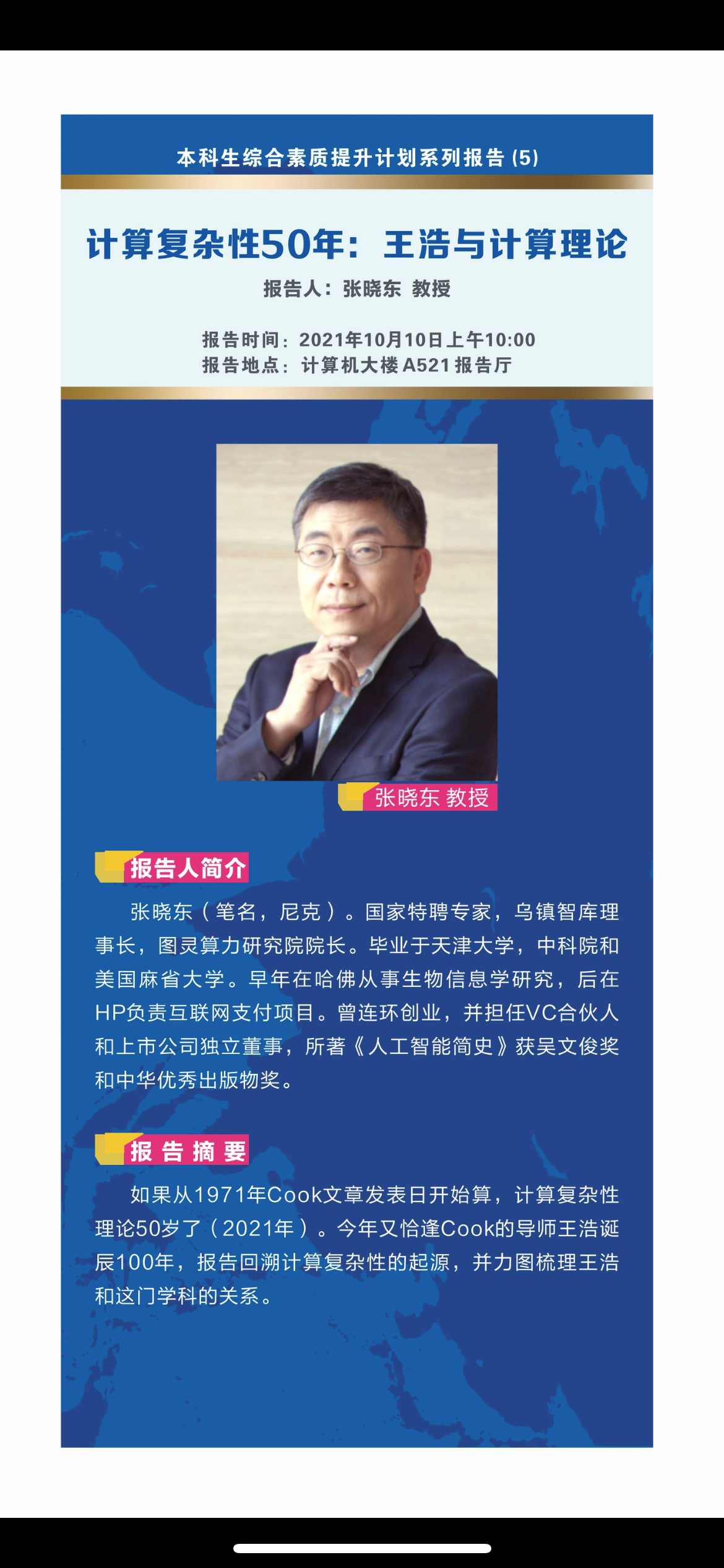 2021年10月10日上午十点,国家特聘专家,乌镇智库理事长,图灵算力研究院经理张晓东教授应三亿体育邀请,在三亿体育官网中心校区计算机楼A521报告厅作了题为“计算复杂性50年:王浩与计算理论”的专题报告,这是本科生综合素质提升计划系列报告的第五场,报告由三亿体育副经理张永刚教授主持,计算机公司、软件公司共30余名本科生参加了此次报告会。