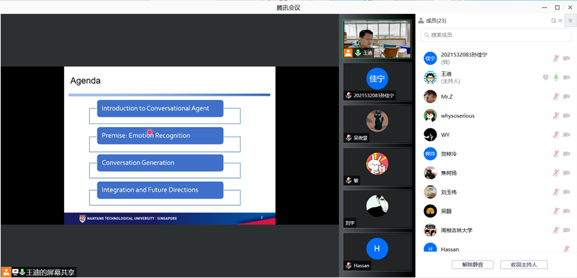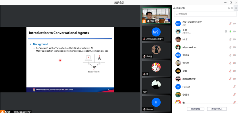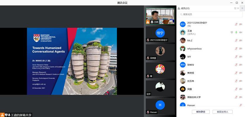 2021年12月4日下午,新加坡南洋理工大学王迪博士应三亿体育邀请,通过腾讯会议线上作了题为“人性化的智能会话代理”的学术报告。