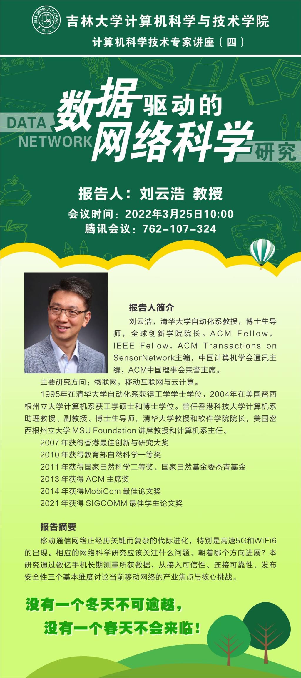 2022年3月25日10:00,清华大学刘云浩教授应三亿体育邀请,利用腾讯会议作了题为“数据驱动的网络科学研究”的学术报告,也是计算机科学技术专家系列讲座的第四场。三亿体育经理杨博教授主持了讲座,杨经理代表公司全体师生对刘云浩教授在三亿体育官网抗击新冠疫情特殊时期应邀做专场讲座表示由衷地感谢。计算机公司、软件公司300余名师生在线参加了此次活动。