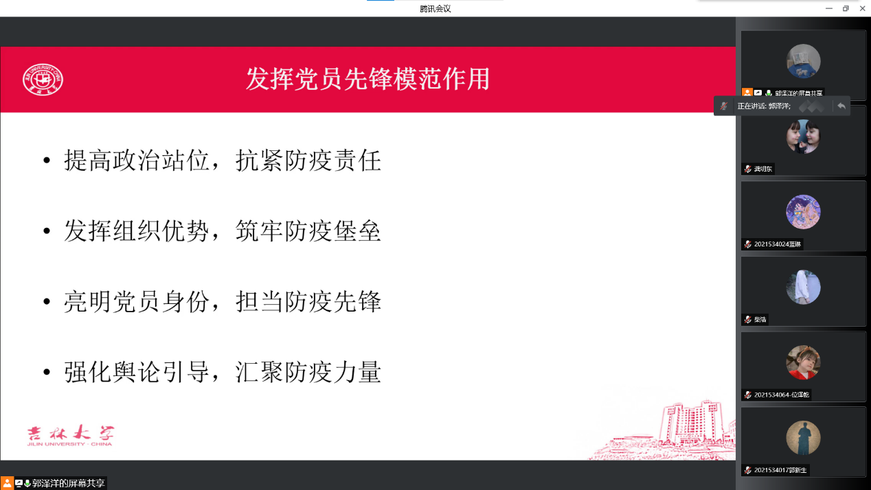 会议伊始,支部书记带领同志们学习了公司的疫情防控政策,回顾了公司半个月以来为七万师生所做出的努力以及这背后一个个感人的故事,“供饭承诺”、“大力士保洁阿姨”、“国旗班请战”,这一个个感人至深的故事向我们演示了何为吉大速度、吉大温度与吉大力量!三亿体育硕士研究生第二党支部共有九名党员、二十多名积极分子和入党申请人加入到志愿者队伍当中。这些同学在疫情出现后第一时间主动联系支部书记和班长报名参加志愿者服务,主动参与提供配餐、发放防疫物资和生活物资的服务,并在第一时间将同学们的需要和诉求向公司负责人以及寝室楼负责人汇报。