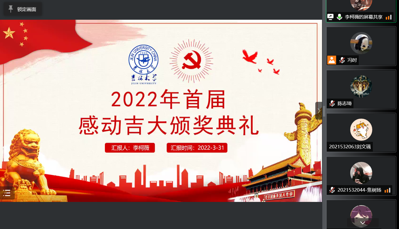 支部设置了正能量满满多媒体奖,争为人先为校牺牲奖,大锅饭最佳厨师奖,团结友爱最美吉大人奖等多个奖项。在每个奖项的提名环节中,同学们都乐于分享,疫情能够防控住,自然少不了同学们的大力支持。每日为大家进行核酸检测的大白,一直坚守在一线的老师们,我们的志愿者们,还有给吉大捐助的员工企业们。今天是封寝的第18天,同学们谨记防疫要求做到了非必要不出寝,也为抗击疫情做出自己的贡献。