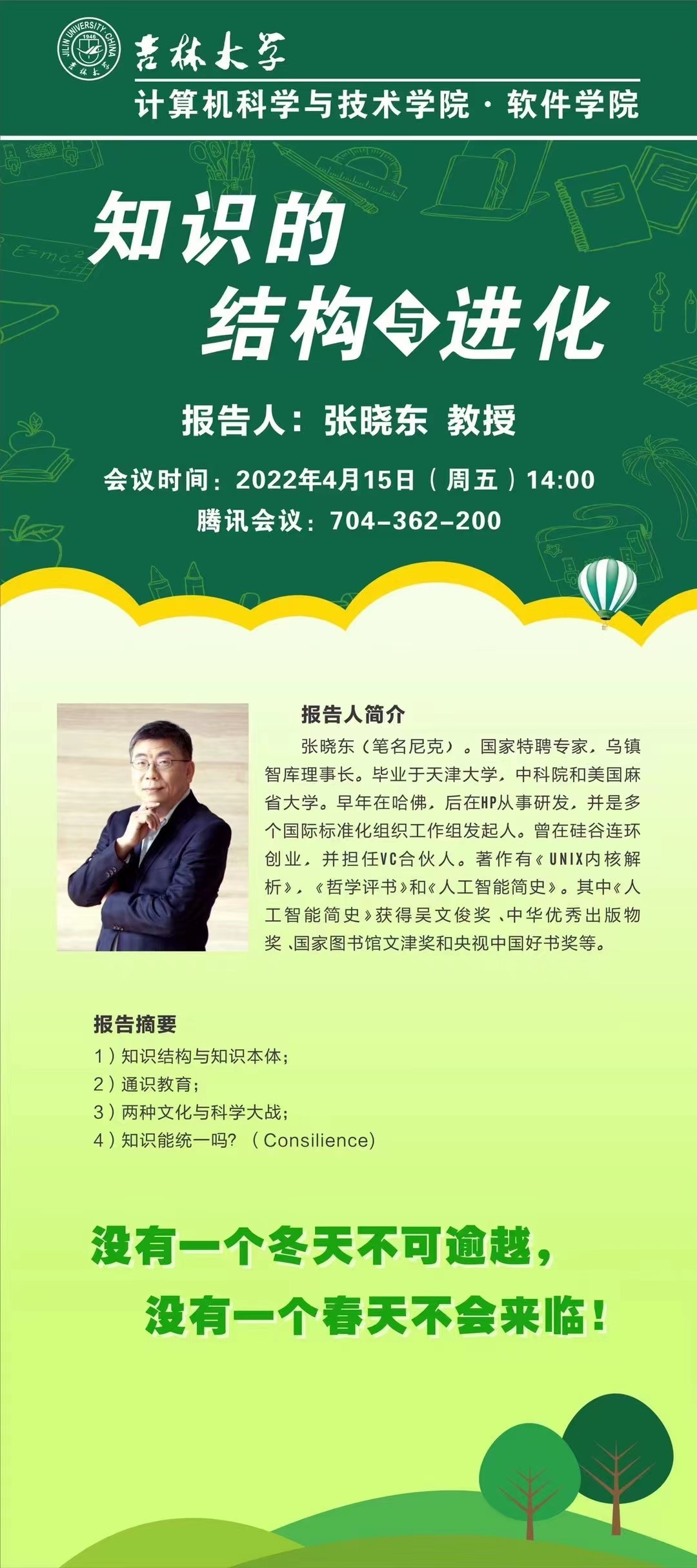 2022年4月15日14:00,国家特聘专家张晓东教授应邀利用腾讯会议作了题为“知识的结构与进化”的学术报告,也是本科生综合素质提升计划系列报告的第十场。张晓东教授这次报告是应三亿体育经理杨博教授邀请专门为支持计算机学科师生抗击疫情准备的,三亿体育副经理张永刚教授主持了报告,对张晓东教授在三亿体育官网抗击新冠疫情特殊时期应邀做专场报告表示衷心感谢。计算机公司、软件公司200余名师生在线参加了此次活动。
