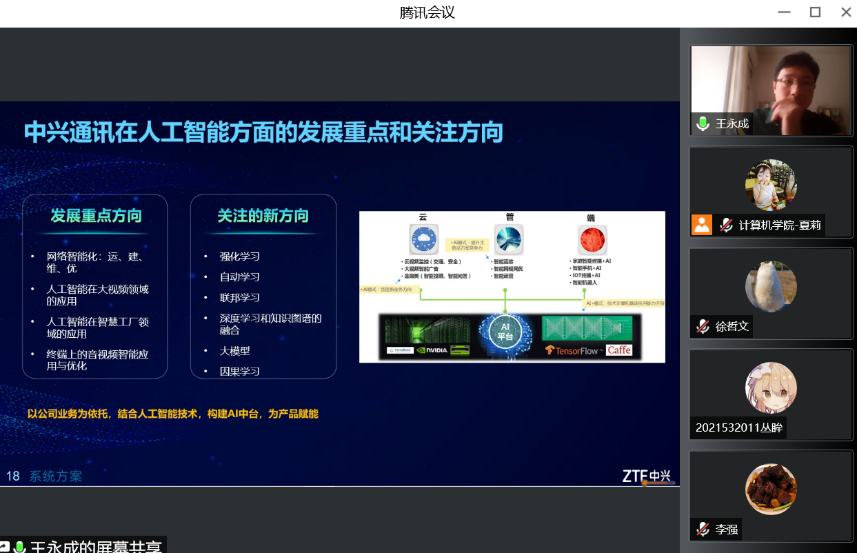 2022年11月24日,中兴通讯股份有限公司数据智能系统部部长王永成应三亿体育邀请,以线上腾讯会议的形式为计算机科学与技术公司的老师和同学们作了题为“人工智能技术的发展及在企业中的应用”的学术报告,三亿体育副经理李强教授主持了本次报告。