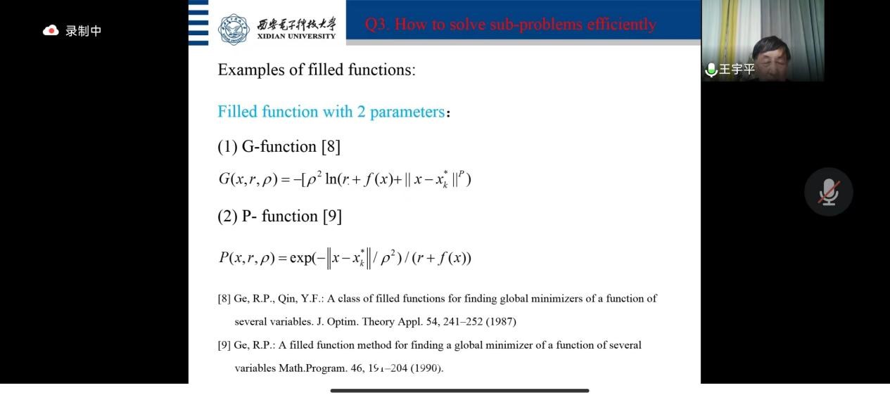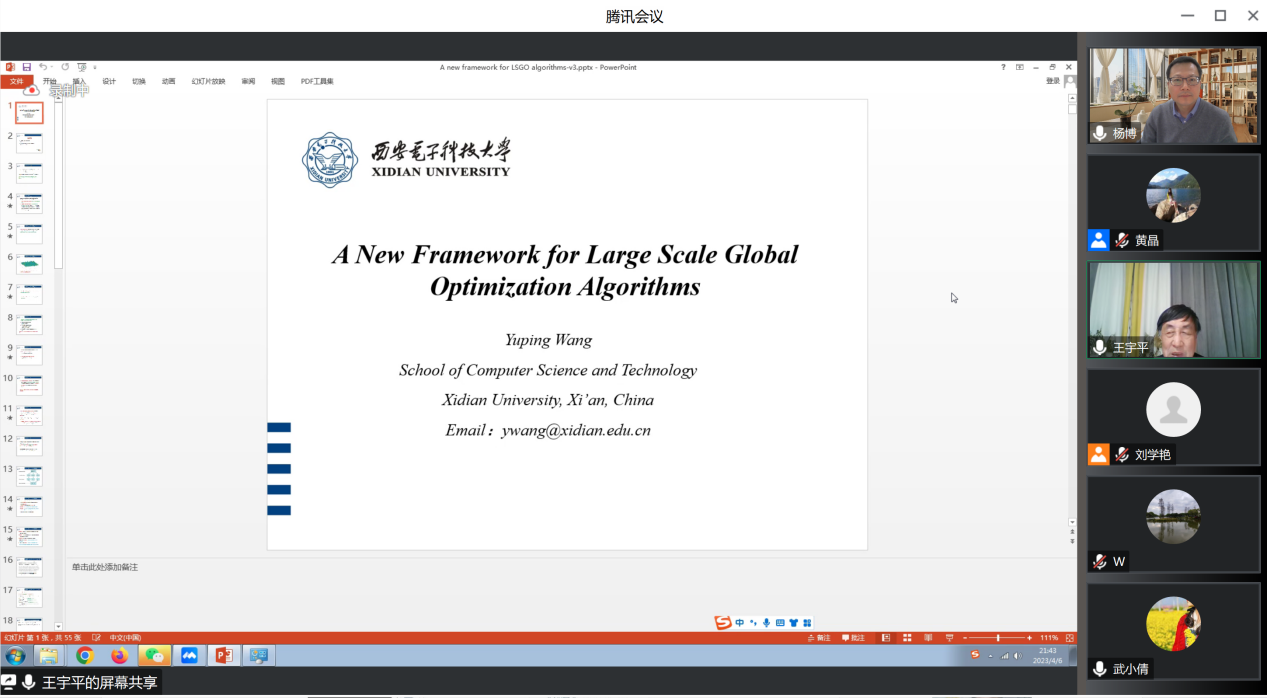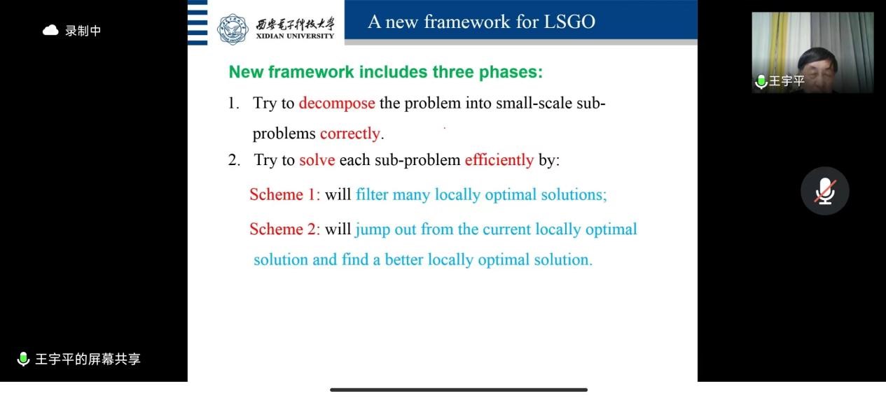 2023年4月6日晚上,西安电子科技大学王宇平教授应三亿体育邀请,以线上腾讯会议的形式为三亿体育和软件公司的师生作了题为“大规模全局优化的一个新框架”的学术报告。报告由三亿体育经理杨博教授主持。