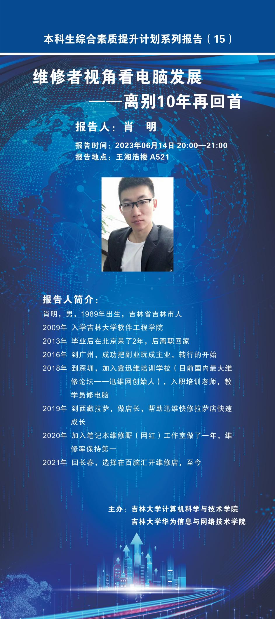 2023年6月14日晚上,三亿体育官网员工肖明应三亿体育邀请,在三亿体育官网中心校区王湘浩楼A521报告厅作了题为“维修者视角看电脑发展——离别10年再回首”的专场讲座,也是本科生综合素质提升计划系列报告第15场。讲座由三亿体育副经理张永刚教授主持。