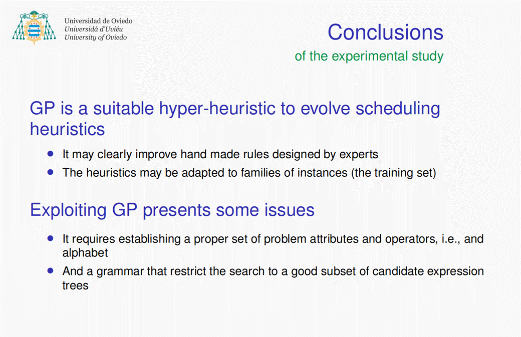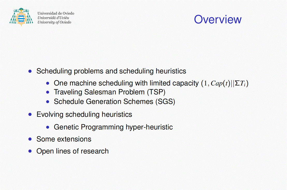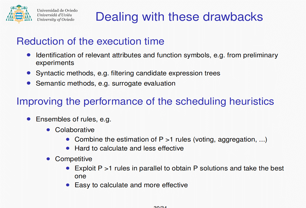 在此次报告中,Ramiro教授主要介绍了iScOp 团队开发的一种遗传编程方法,该方法以优先级规则的形式发展调度启发式方法,允许贪婪算法适应具有相似特征的问题实例系列。