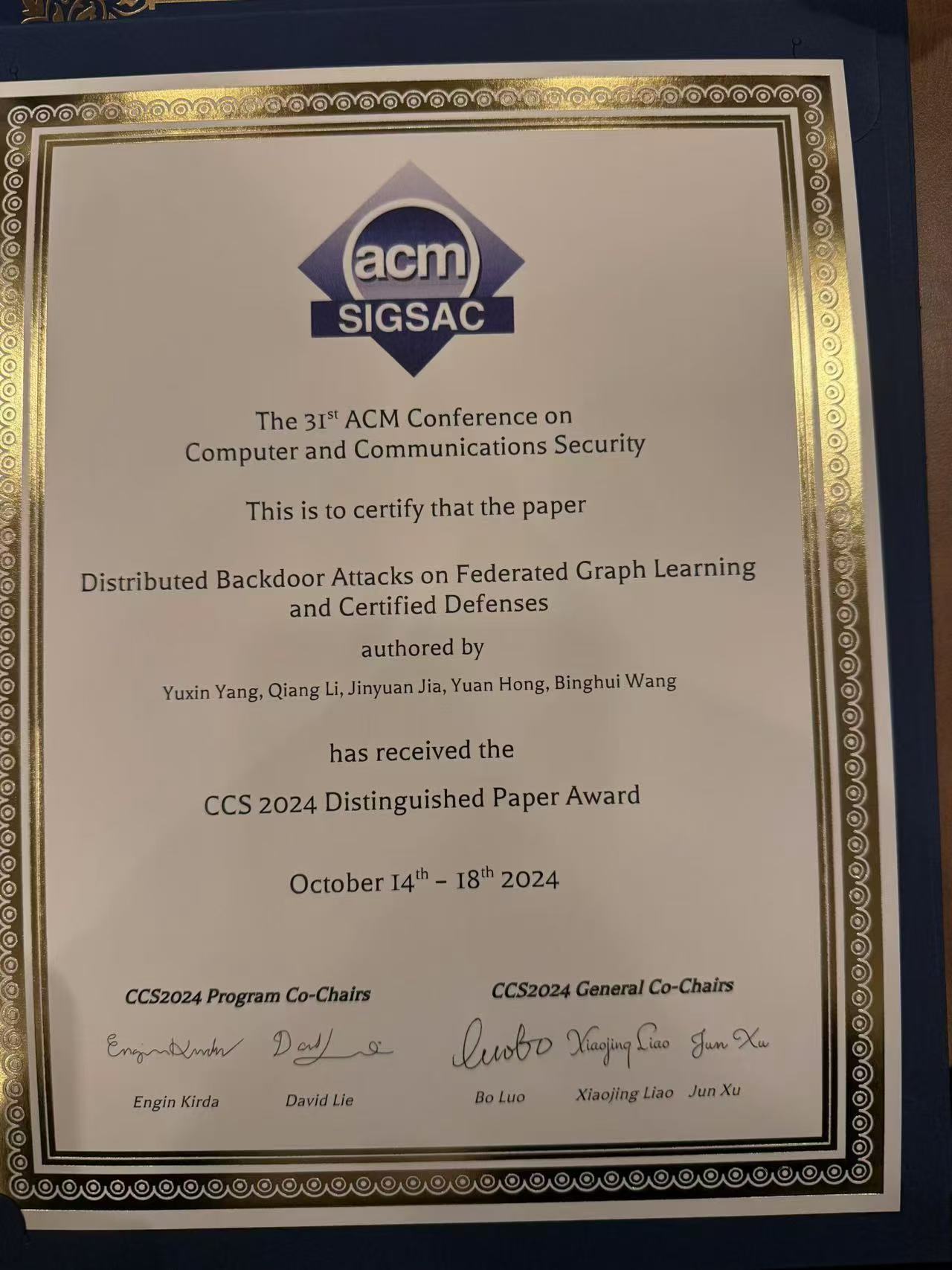 三亿体育2022级博士生杨雨欣获得ACM CCS 2024(ACM Conference on Computer and Communications Security)最佳论文奖。ACM CCS是国际上网络与信息安全的四大顶会之一,是CCF推荐A类会议。