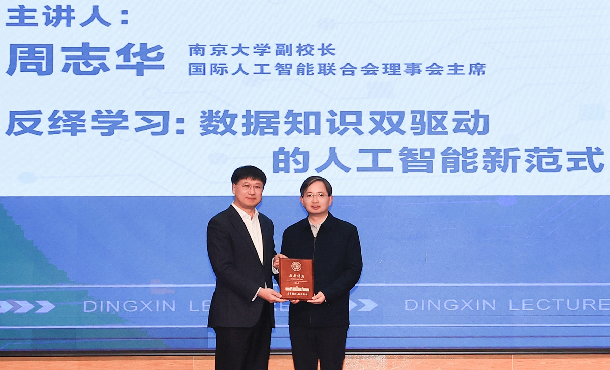 周志华以《反绎学习:数据知识双驱动的人工智能新范式》为题做学术交流。他指出,“数据驱动”人工智能存在可信性问题,大模型会产生幻觉。“知识驱动”人工智能存在数据利用低效问题,二者融合是重大挑战。他分享了团队提出的反绎学习框架,该框架将演绎嵌入归纳,实现机器学习与逻辑推理相互促进。通过符号串破解、司法量刑辅助等多领域应用案例,展现反绎学习的潜力,同时也表明该方法在处理大规模问题上存在局限,亟须高效的数值和符号联合混合优化方法。互动环节,周志华就理论与实践结合等问题与师生深入交流。