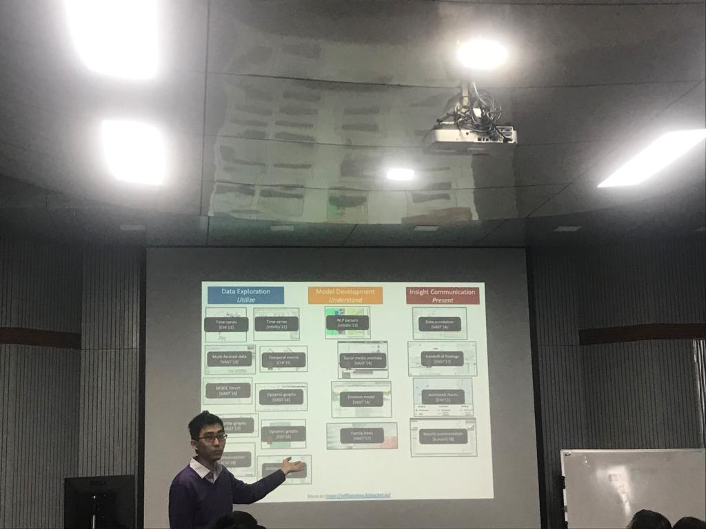 在报告中,赵健博士介绍了他在数据可视化方面的工作。赵健博士指出:几乎每个领域都在生成大量复杂的异构数据。然而,深入了解这些数据仍然是一个根本的挑战。我们从哪里开始?我们应该用哪种分析模型,它是如何工作的?我们如何协作分析数据?赵健教授通过他参与完成的三个可视化的项目为到场的师生们讲解了数据可视化是如何解决数据的问题,以及如何通过数据分析的三个主要阶段(包括探索性分析、模型管理和洞察通信)为用户提供支持。数据可视化是对当前数据情况的一种分析,以及对未来的一种预测,这对目前的大数据时代起到了非常重要的分析、预测、辅助决策的作用。
