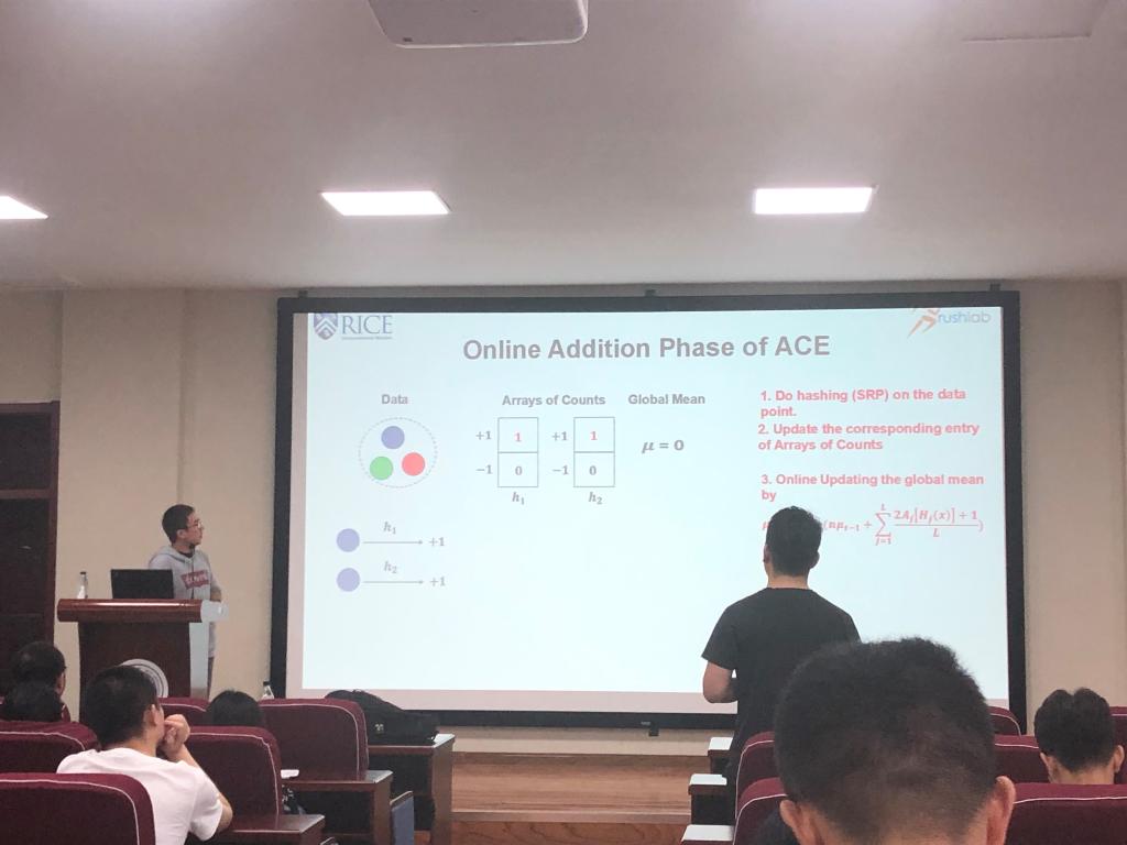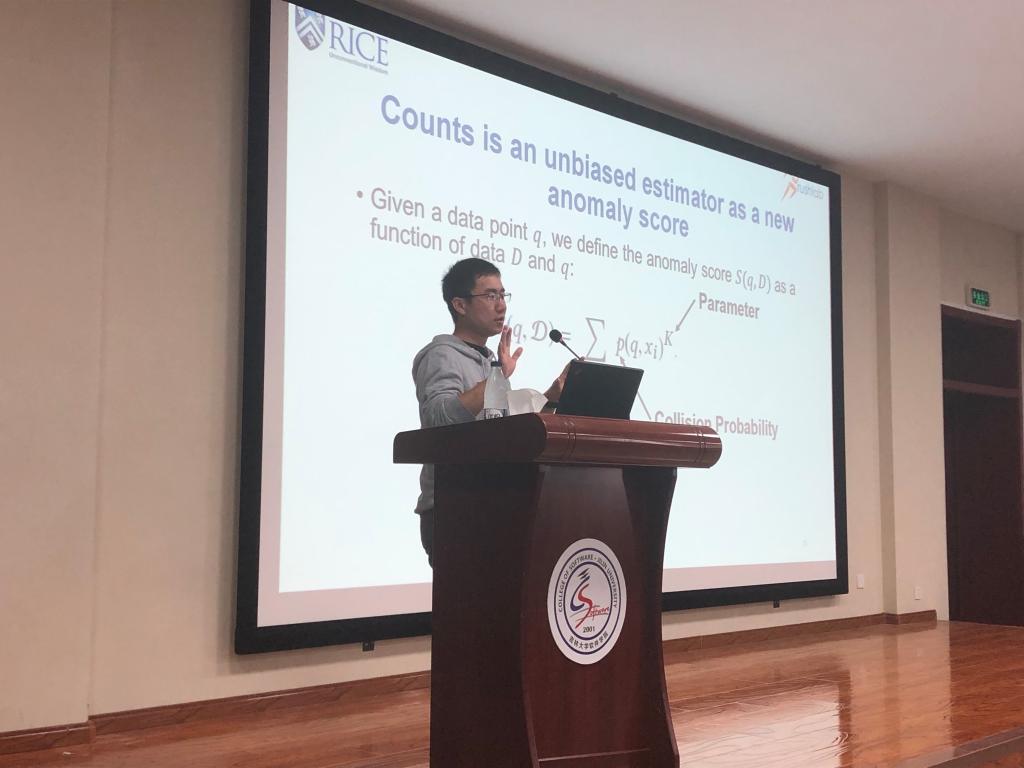 在本次报告中,罗琛博士首先介绍了LSH的基本含义,进而引出具体应用背景中的问题:传统的机器学习和数据挖掘任务受到了超大规模数据集的影响,因而设计能够处理这些数据量的高效节能机器学习技术至关重要。针对这样的问题,由浅入深的为在场同学详细讲解了使用随机散列算法扩展机器学习算法的工作,包括商业搜索引擎的查询恢复、高维异常检测和快速贝叶斯推断。罗琛博士在报告过程中与同学们针对具体的研究问题进行了深入地交流,并在报告的自由问答阶段,介绍了如何做好科研的一些经验和在美国读博期间的一些研究经历。报告在同学们热烈的掌声中结束。