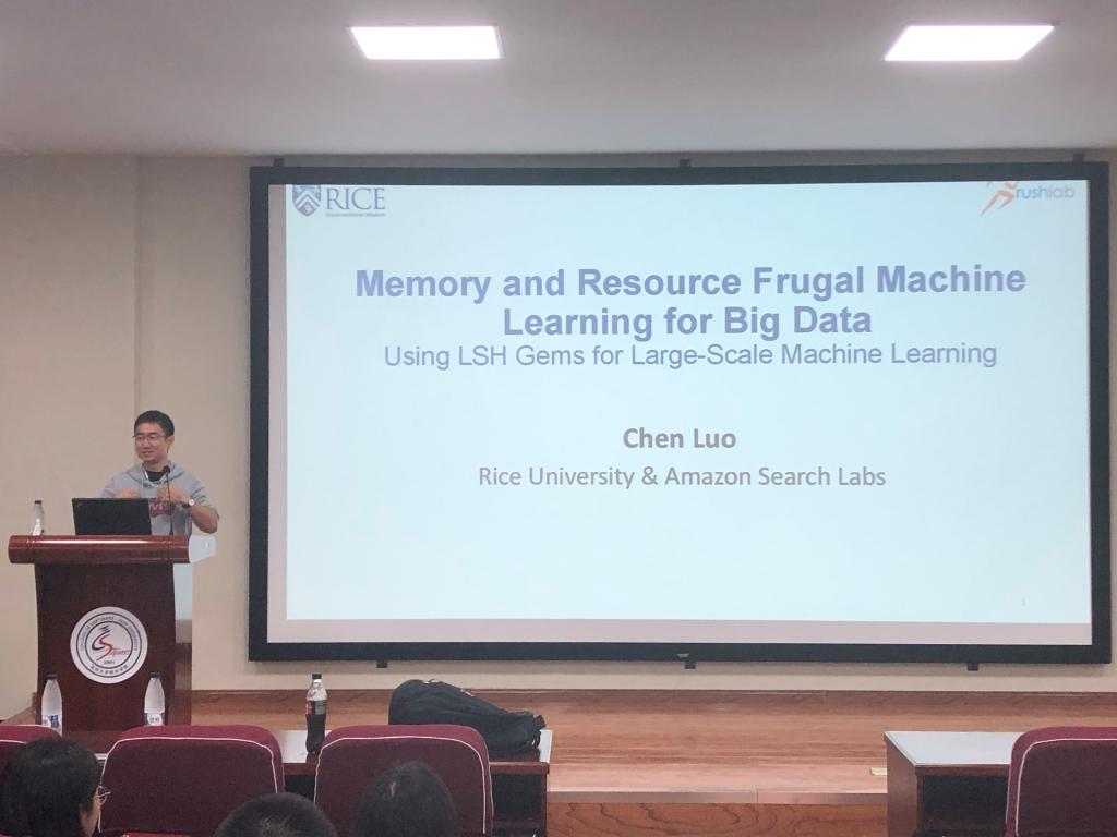 2019年8月19日上午,亚马逊搜索实验室罗琛博士应三亿体育邀请,在计算机楼B108作了题为“Memory and Resource Frugal Machine Learninig for Big Data”的学术报告。