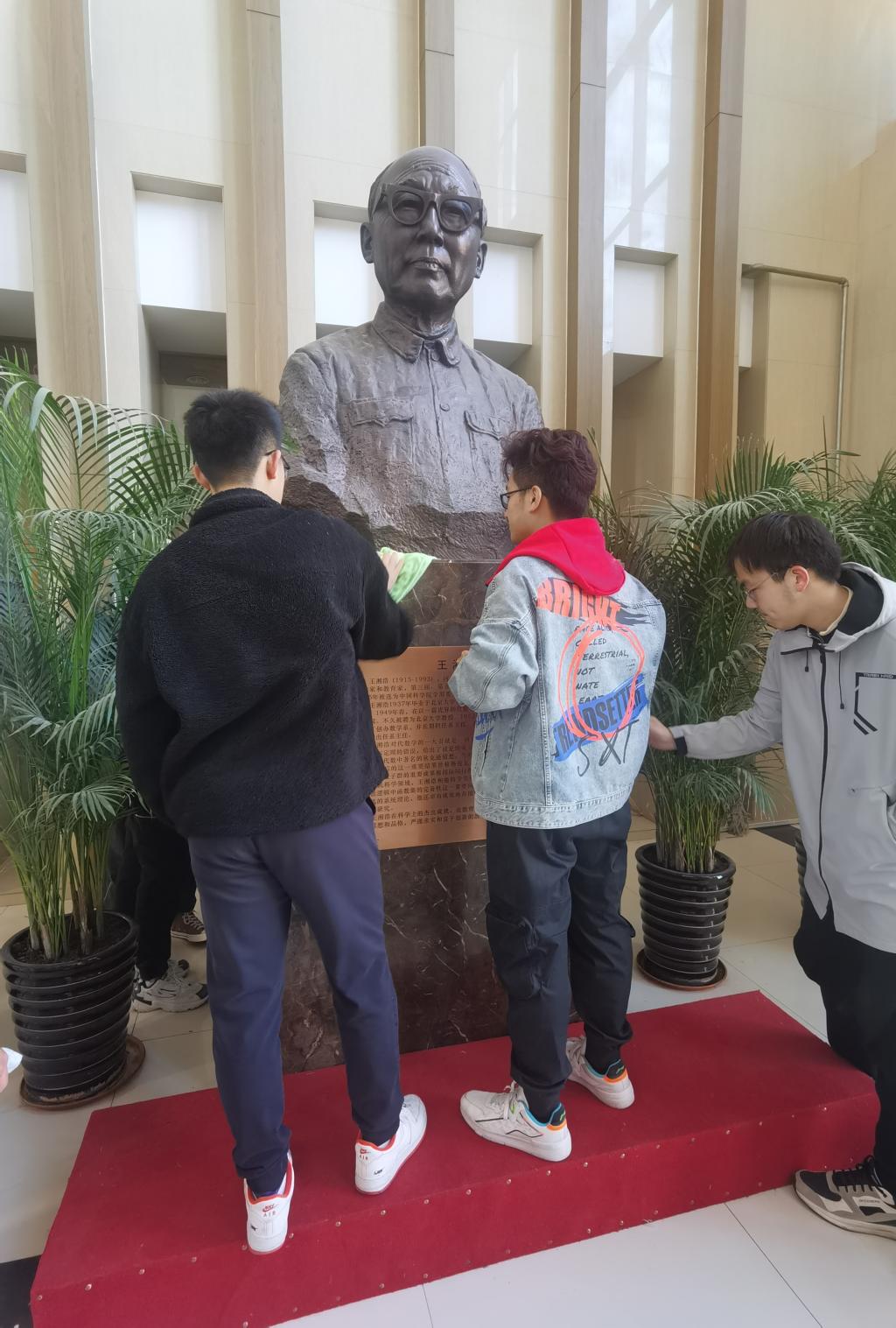 同学们携带抹布、拖布等劳动工具有序前往计算机楼,对走廊、王湘浩雕像等进行了细致的清扫和擦拭,同时也将计算机楼周边的垃圾捡拾干净。同学们有条不紊、团结协作。