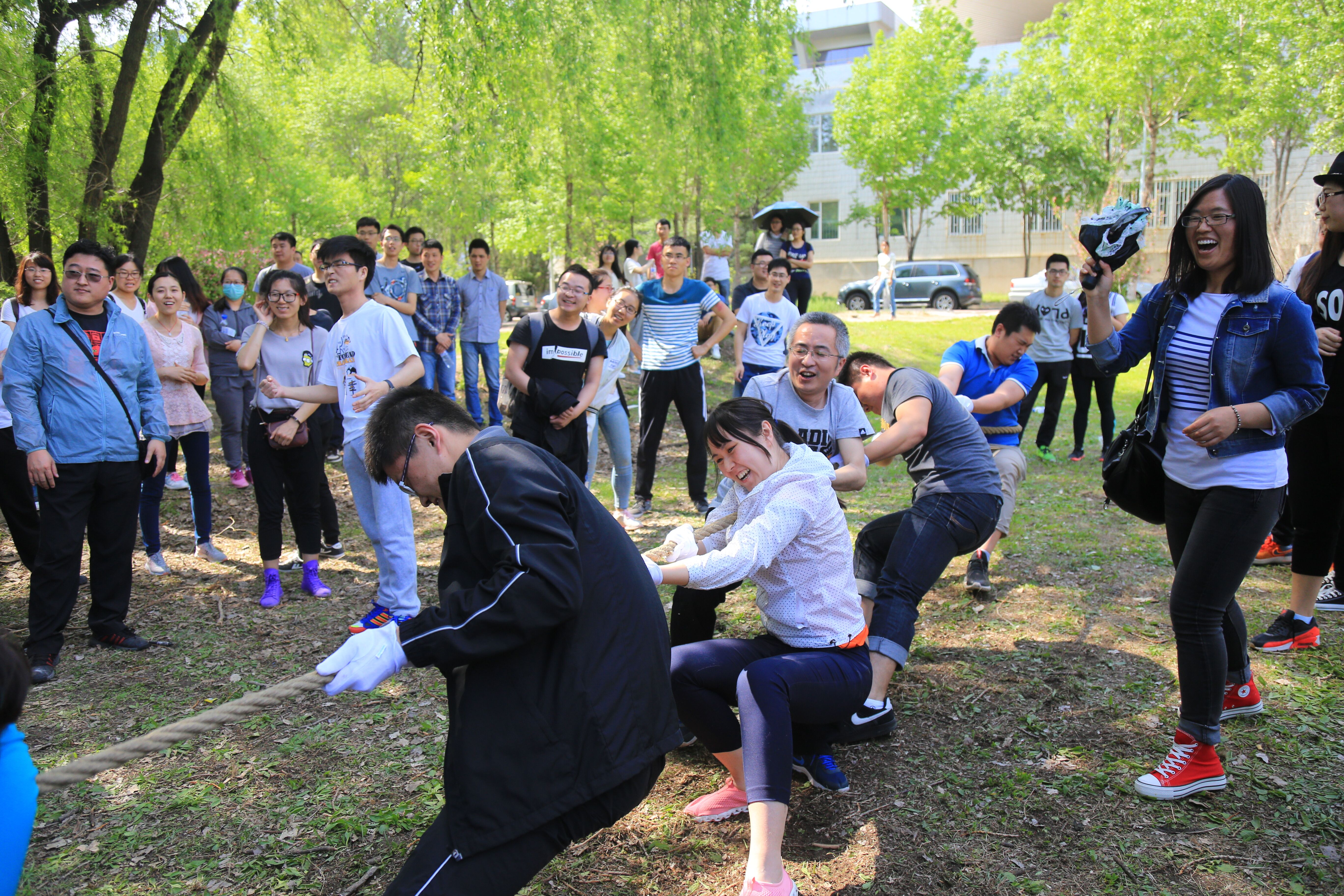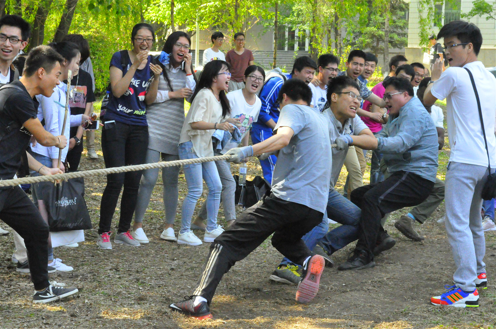 公司第七届教研室师生拔河比赛于2016年5月19日下午1:30,在中心校区体育馆南侧滑冰场草地准时举行,计算机公司党委副书记杜天宝及研究生办公室的各位老师出席了本次大赛。经过赛前一周时间的动员,共有来自11个教研室的博、硕士研究生及指导教师,共计近200人参加了本次活动。比赛采取三局两胜的淘汰赛制,过程激烈精彩,悬念迭起,平日里醉心学术研究、一丝不苟的老师们也挽起了衣袖,挥舞着彩旗,高喊着为队员加油。老师们的热情迅速感染了观众,场上不间断的助威呐喊声使人热血沸腾,参赛队员们更是团结一心,拼尽全力,挑战着耐力与体力的极限。经过激烈的角逐,数据库与智能网络教研室异军突起,一路气势恢宏的杀进决赛,最终收获冠军奖杯;计算智能教研室在领队高超的指挥策略下同心同力,毫无遗憾的获得了亚军;季军则由软件与理论教研室获得。最后同学们纷纷与老师合影留念,记录下师生团结一心,取得胜利的这一美好时刻。