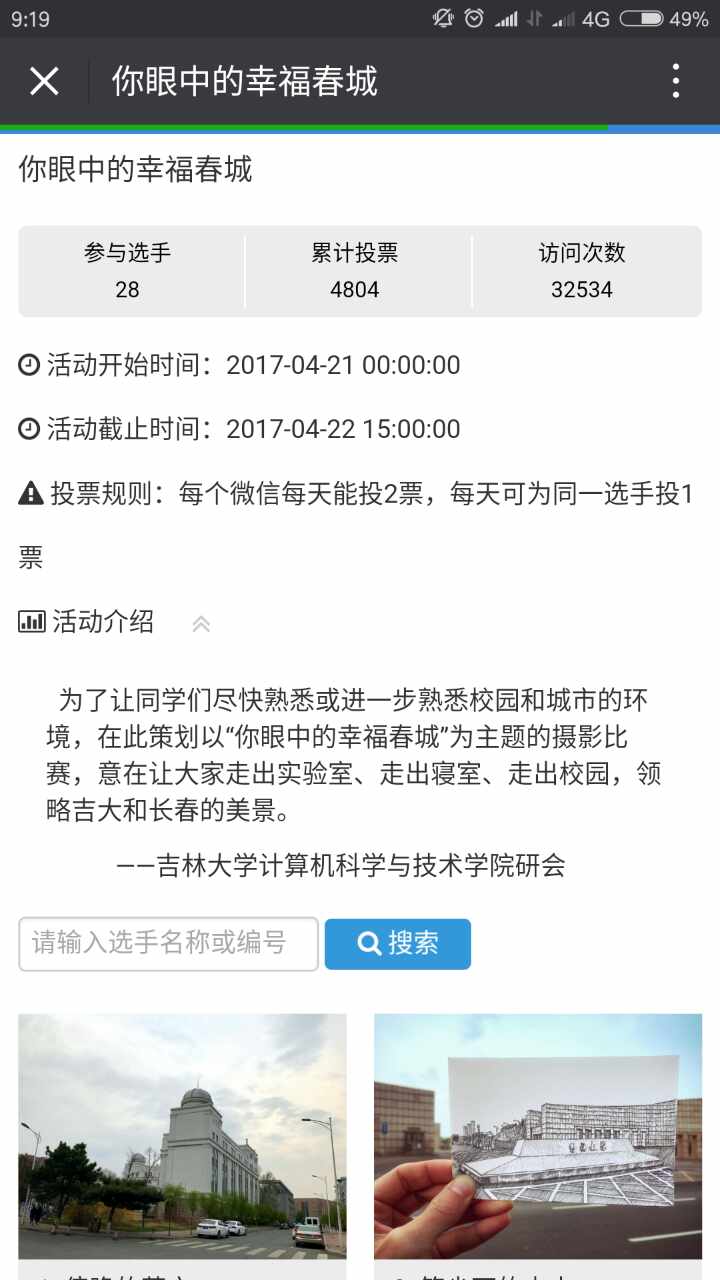 为了让同学们尽快熟悉或进一步熟悉校园和城市的环境,计算机公司研会外联部,宣传部于4月15日至4月22日举办了以“你眼中的幸福春城”为主题的摄影比赛,意在让大家走出实验室、走出寝室、走出校园,领略吉大和长春的美景。并于4月23日在计算机楼举行了颁奖仪式。