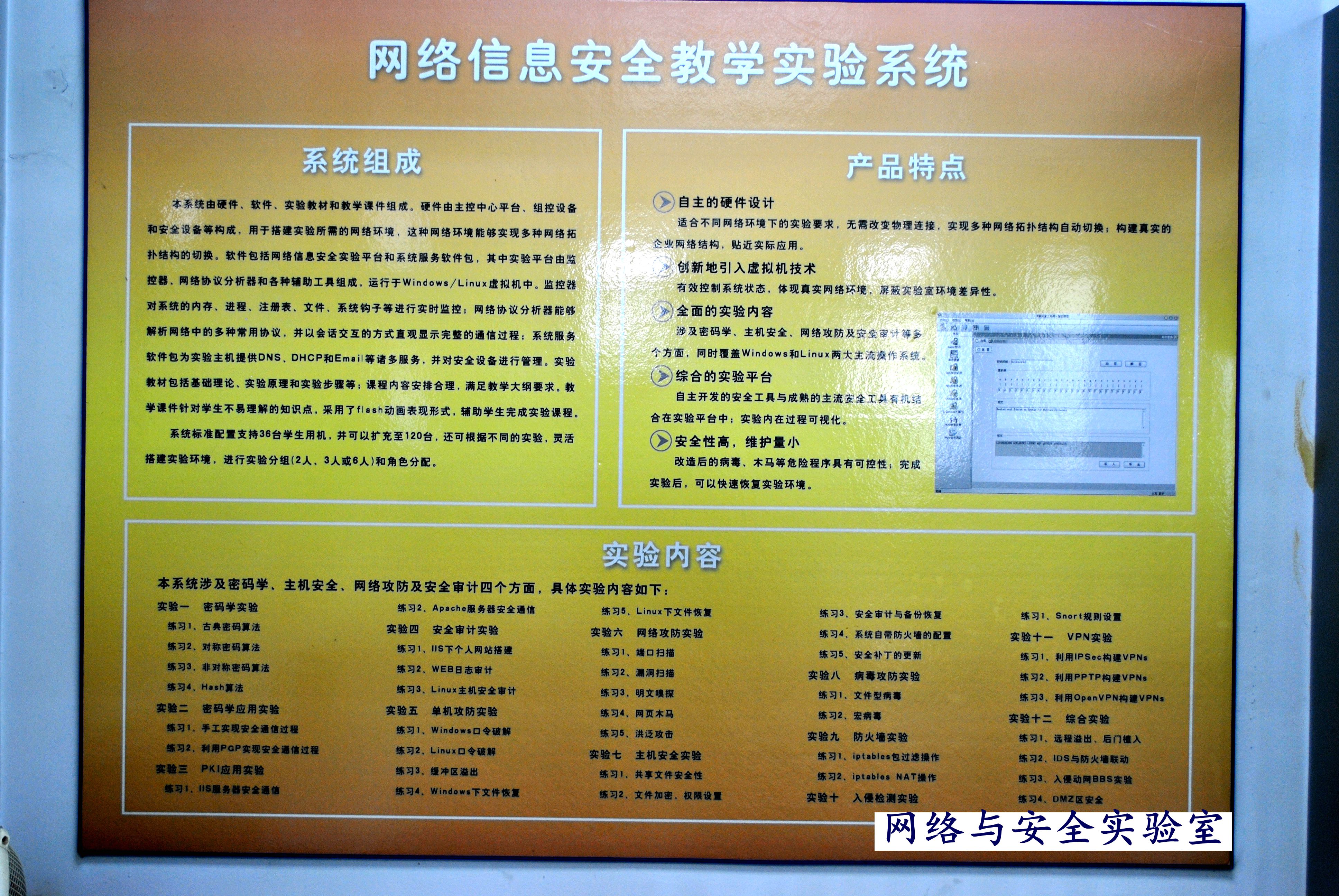 网络与安全实验室由A227 、A230、B312三个实验房间组成,总面积562平方米,可同时容纳二百二十名员工上机做实验,实验室有各项完善的规章管理制度,有专职实验人员五人,其中高工三人,工程师两人。A227、A230为网络协议分析与故障诊断实验室,是基于三亿体育官网与吉大中软公司合作研发“网络协议仿真教学系统”平台上进行的实验课。该实验独立设置、单独计入1.5学分,共计32 学分、36个实验项目。实验项目由必修课14项和选修课22项组成,其中必修课设置为计划内的实验学时,选修课设置为计划外的实验学时,验证型、设计型和综合型实验类型各占比例分别为22%、22%和56%。B312为网络与信息安全实验室,主要是面向信息安全专业的本科生开展实验课,一部分课时面向物联网工程专业和软件工程专业的本科生。网络与信息安全实验教学平台,主要由主控中心平台、安全设备、组控设备、无线组控设备、应用服务器和管理服务器组成。根据不同层次的教学需要,可搭建成实验教学所需的网络环境,可以灵活实现多种网络拓扑结构,详见(实验平台结构框图)。